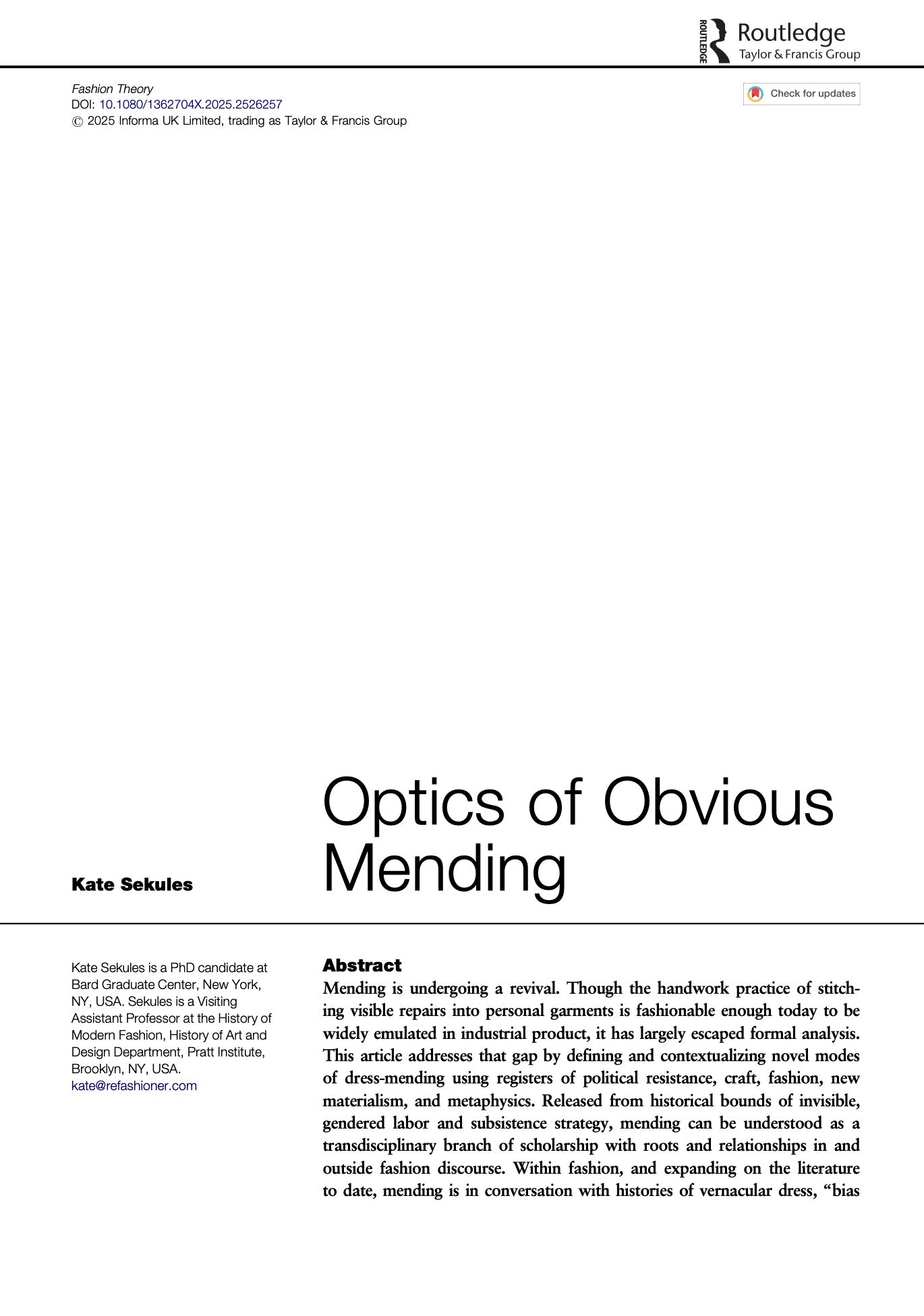 Optics of Obvious Mending Abstract Mending is undergoing a revival. Though the handwork practice of stitching visible repairs into personal garments is fashionable enough today... View full details